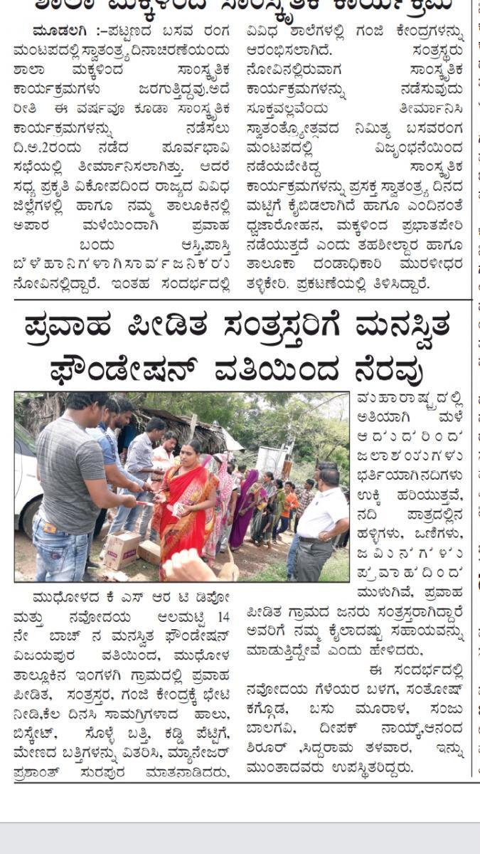 We from our foundation did our bit to help the stranded, part of the task we visited the villages of Mudhol and Jamakhandi Taluqs (Halingali, Ingalagi) and served the meals for the flood victims and distributed the daily necessities(milk packets, candles, mosquito coils, biscuits, winter caps etc). We could feel the sense of gratitude in the eyes of flood victims.